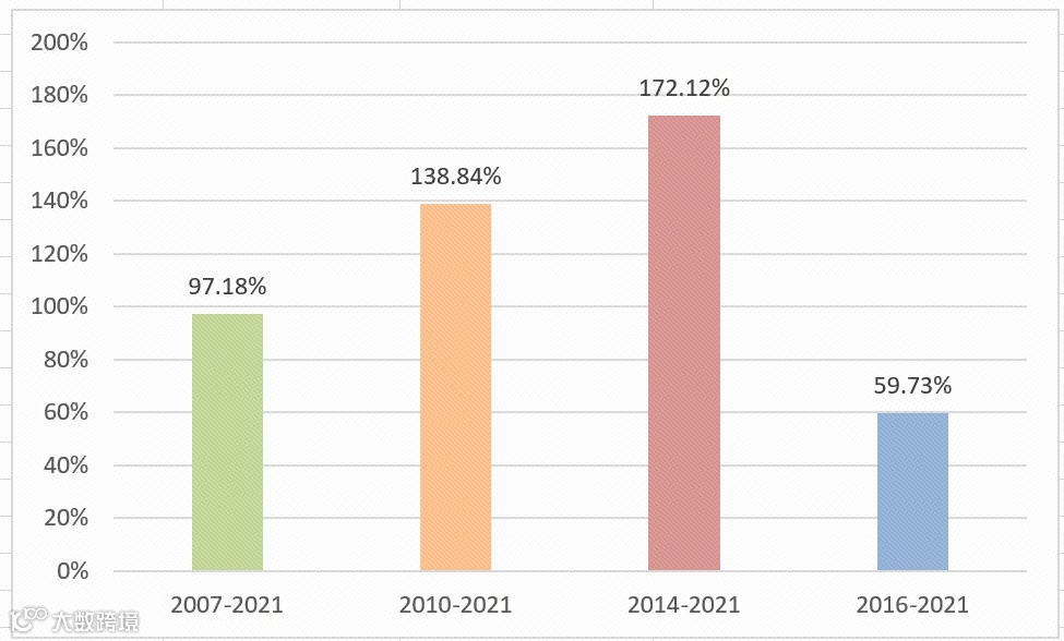 我们将这个时间维度拉长,据测算,如果从2010年初入场并持有至今,以偏股基金指数为例,涨幅将达到138.64%。2007、2014、2016这三年也是如此,虽然年初遇到一波调整,如果从当时持有偏股基金指数至2021年底,涨幅非常可观。