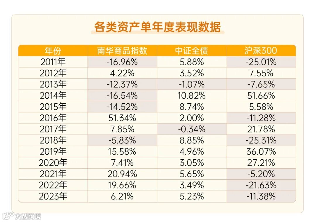 股票、债券、商品等大类资产皆有属于自己的周期,在不同时间有不同的表现。从2011年至今,不同资产各年度表现差异较大,若投资者仅持有某一类资产,便会可能在某些年份遭遇较大回撤。