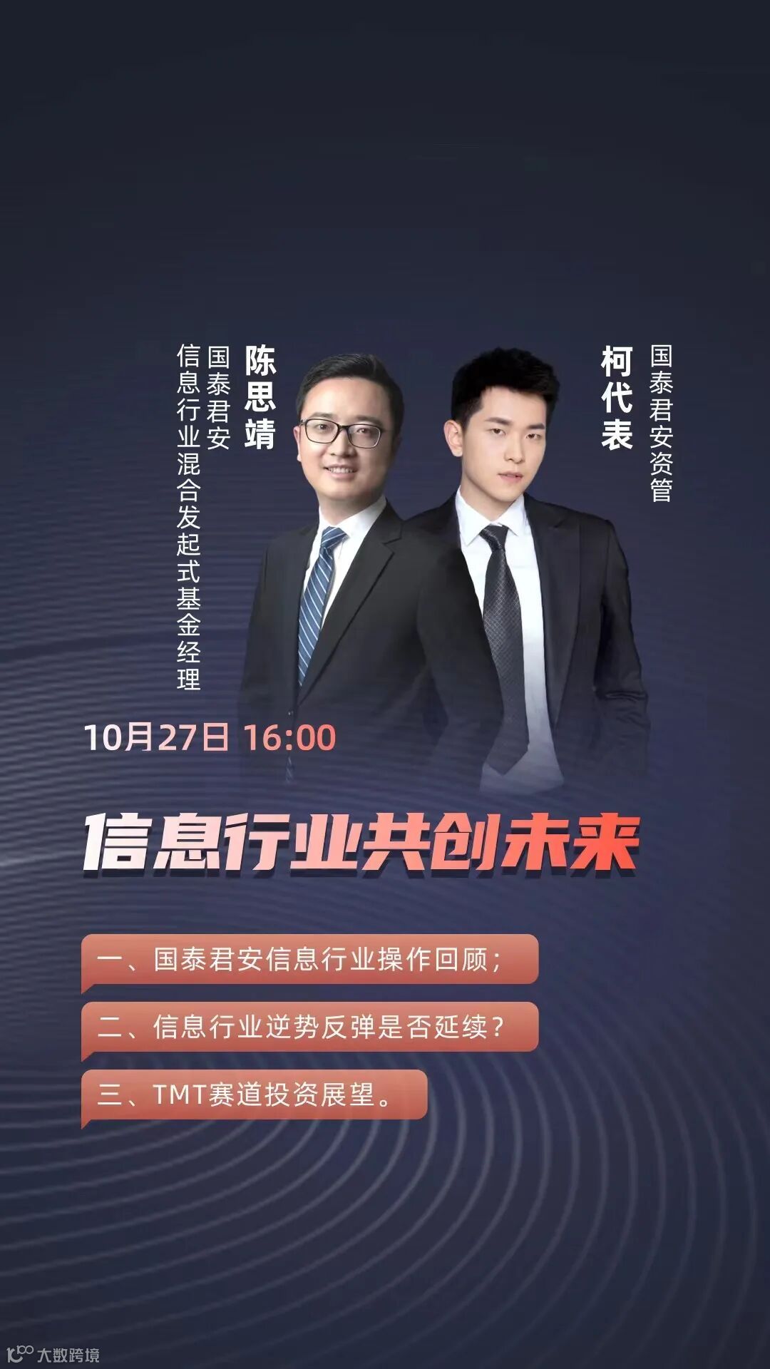 10月27日(星期四)国泰君安资管直播间,国泰君安信息行业混合发起式基金经理 陈思靖 将为大家倾情讲解,不见不散!