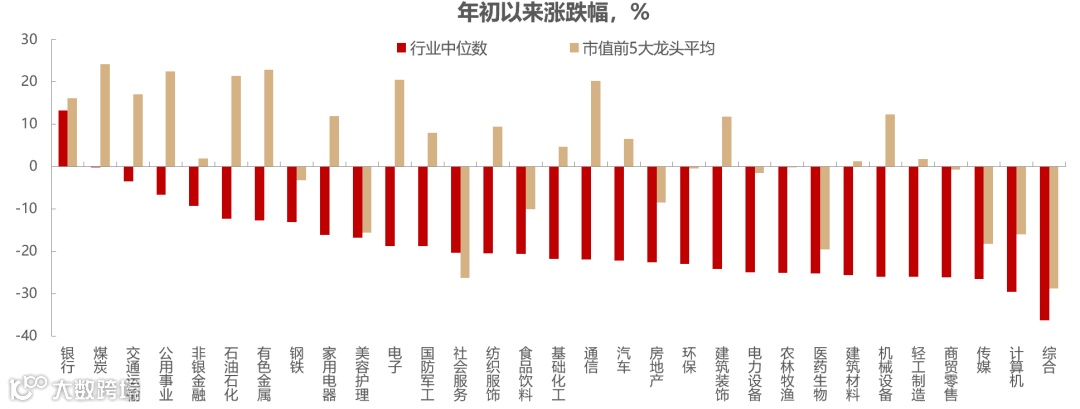 图13:申万一级行业涨跌幅中位数和龙头表现对比