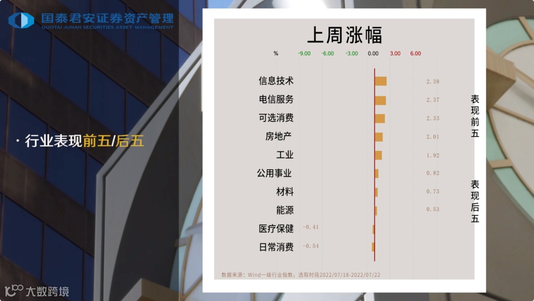 上周多数行业上涨。信息技术领涨,涨幅达2.38%,电信服务、可选消费等行业均有明显上涨,仅有日常消费与医疗保健这两个行业下跌。