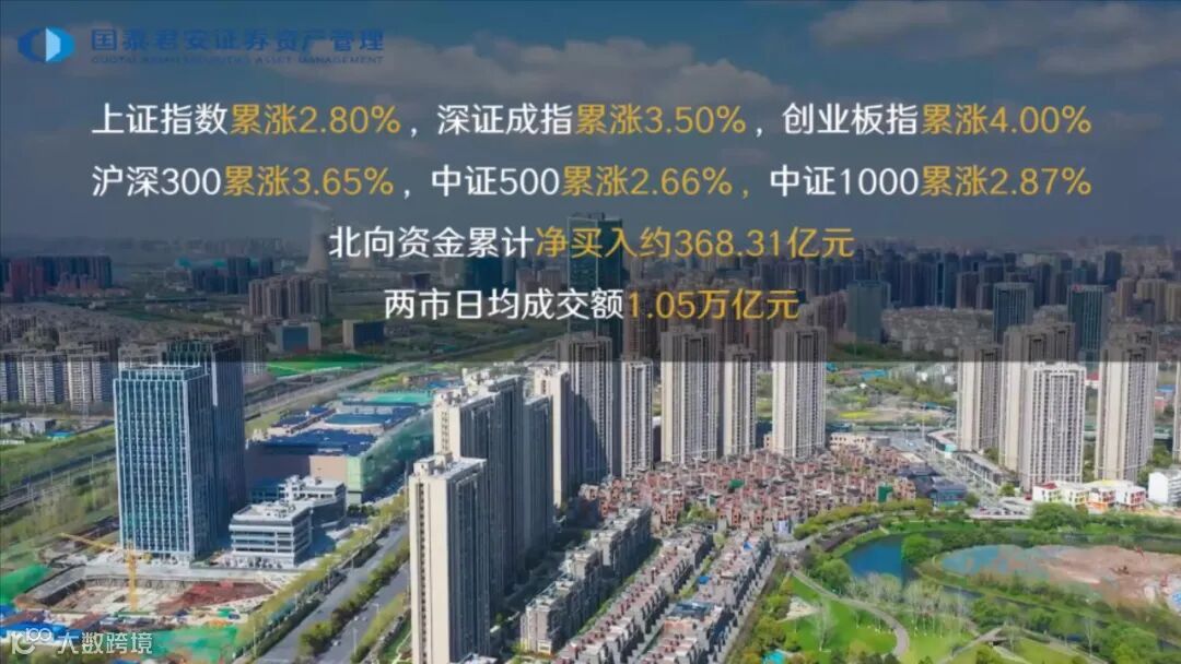 最近一周A股整体呈现普涨态势,上证指数累涨2.8%,深证成指累涨3.5%,创业板指累涨4%,沪深300累涨3.65%,中证500累涨2.66%,中证1000累涨2.87%。北向资金本周大幅买入约368亿元,相比上周增加115亿元,两市日均成交额突破1万亿元。