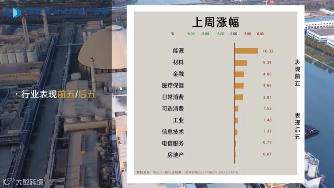 上周行业呈现普涨态势。能源行业领涨,涨幅超10%,材料、金融、医疗保健等行业均有明显上涨,房地产行业涨幅居于最后,仅上涨0.07%。