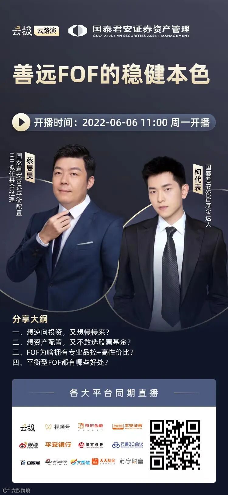 6月6日(星期一)11:00 国泰君安资管直播间,国泰君安善远平衡配置一年持有混合(FOF)拟任基金经理 蔡旻昊将为大家倾情讲解,不见不散!