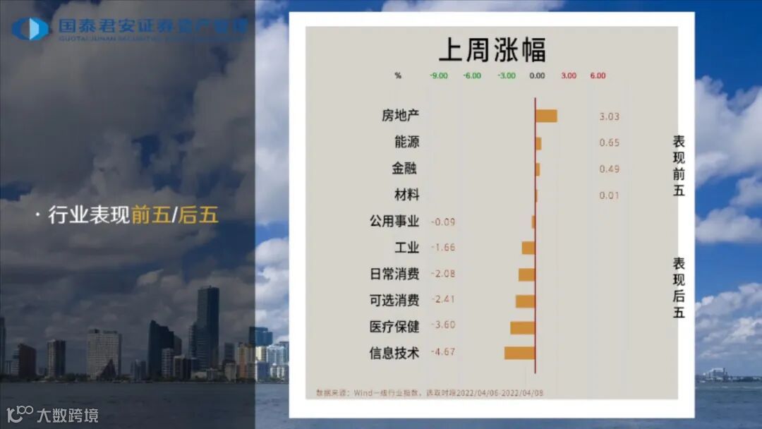 行业变动来看,上周各行业涨跌互现,房地产仍然保持领涨,涨幅达3.03%;信息技术行业领跌,跌幅达4.67%。