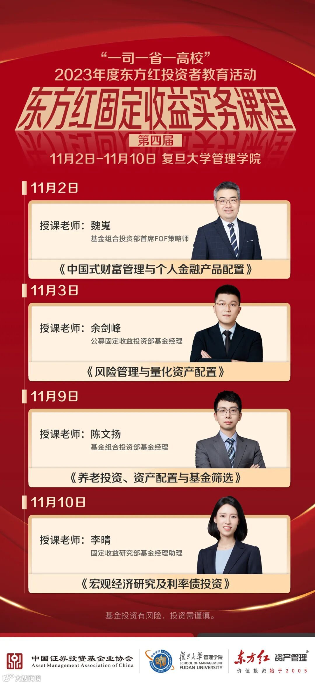 2023年11月2日起,在中国证券投资基金业协会的指导下,东方红资产管理将走进复旦大学校园,与复旦大学管理学院合作推出第四届“东方红固定收益实务课程”,进一步推进投资者教育纳入国民教育体系。课程邀请包括东方红首席FOF策略师魏嵬、基金经理陈文扬、基金经理余剑峰、基金经理助理李晴在内的四位东方红资深基金经理、策略师和研究员进行授课,深入实践“一司一省一高校”投资者教育工作。