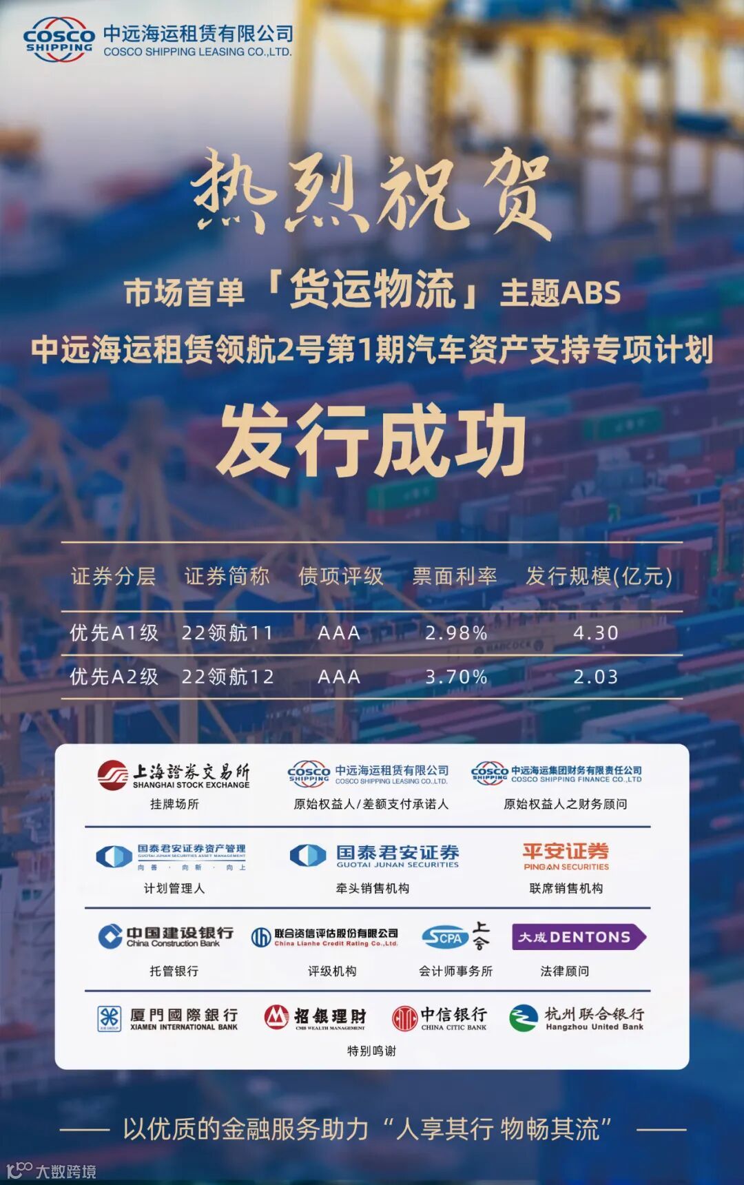由国泰君安证券资产管理公司担任计划管理人、国泰君安证券担任牵头销售机构的中远海运租赁领航2号第1期汽车资产支持专项计划,于2022年6月16日成功发行。值得一提的是,这是目前市场上的首单货运物流主题资产证券化项目。