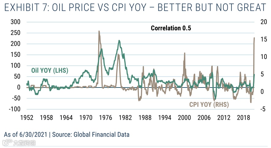 关于短期通胀对冲的观点,我们再次看到石油和其他大宗商品之间的显著差异(原因很明显,石油/天然气是CPI的直接组成部分)。按年计算,非石油商品与CPI的相关性为0.3,而石油价格与CPI的相关性为0.5(见附录6和7)。