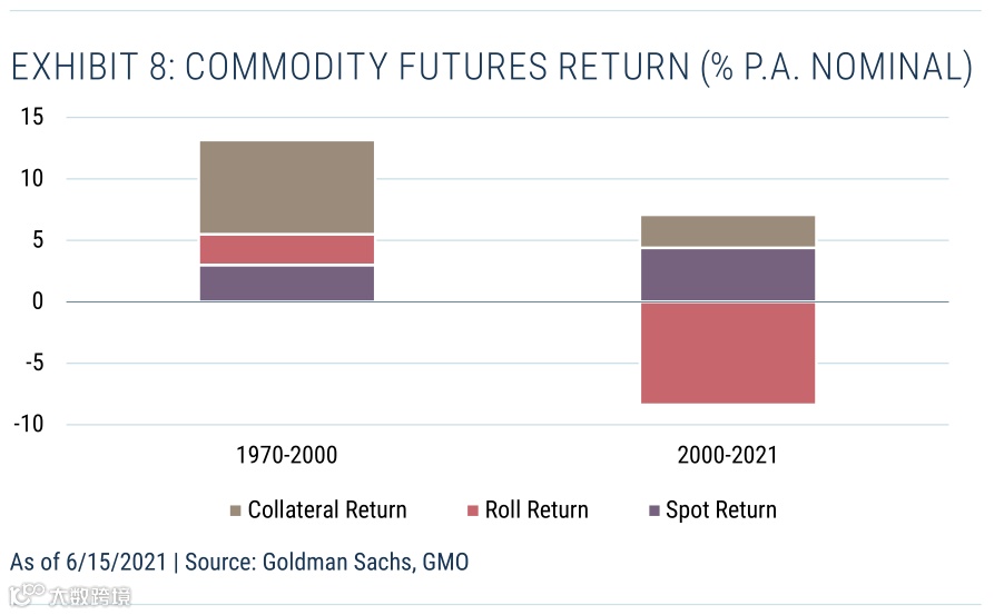 尽管有传统观点,但大宗商品(除石油外)既不是一种好的价值储存手段,也不是一种好的通胀对冲手段。此外,投资者通常通过商品期货获得大宗商品敞口,而商品期货的抵押品回报和滚动回报构成的总回报进一步搅浑了局面,导致投资者所体验到的实现结果与简单的现货商品价格所显示的结果截然不同。