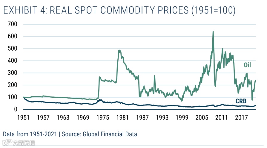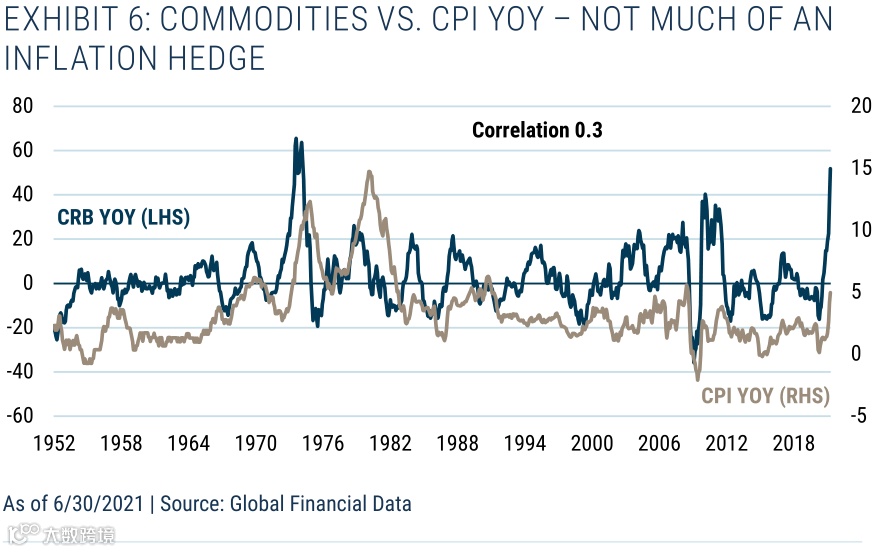 传统观点认为,大宗商品是很好的通胀对冲工具/价值储存手段。然而,当我们检验这些数据时,我们是直接持有大宗商品现货价格,还是通过期货交易持有敞口,往往发现,传统观点并非特别明智。稍后我们将研究大宗商品股权(从通胀保护的角度来看,大宗商品股权更多地依赖于权益性质,而非大宗商品敞口)。