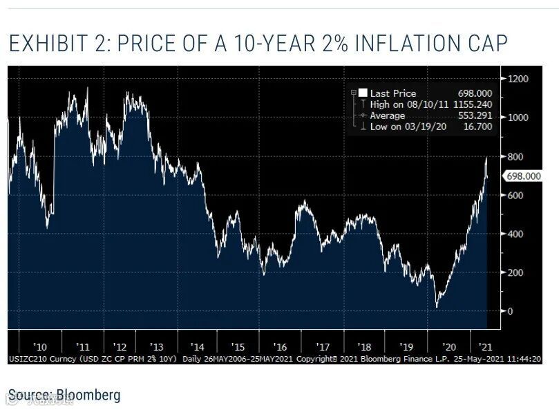 与上述工具密切相关的一种工具是通胀上限。如果通胀高于所选择的水平,这些衍生工具将获得回报。例如,表2显示了10年期2%通胀上限的价格。再一次,毫无疑问,这些工具将对冲通胀,但它们确实比TIPS有更大的交易对手风险。