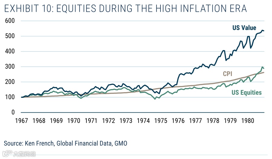 如果人们对通胀的担忧是为了保值,而不是为了对冲通胀,那么显而易见的做法是寻找廉价的“真实资产”来源。正如本文开头所指出的,股票是真实资产,因此在这种情况下,廉价股票应该具有吸引力。如表10所示,美国股市在高通胀时期发挥了保值作用,尽管评级大幅下调,整体市场Shiller P/Es从20.4倍降至9倍!然而,价值型股票的表现要好得多。拥有廉价的真实资产似乎是保护自己不受通胀影响的一个很好的方法(就价值储存而言)。
