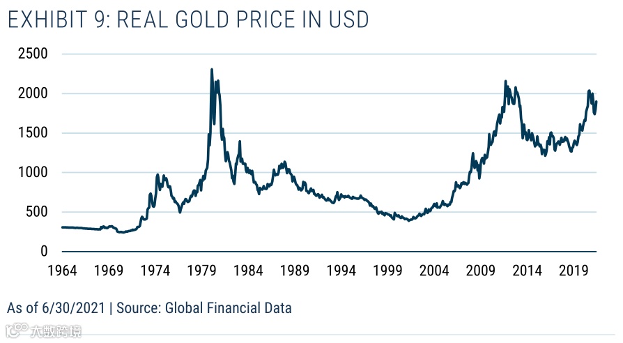 说到通货膨胀,黄金显然在20世纪60年代末和70年代的通货膨胀中起到了保值作用,在1967年到1980年间产生了15%的实际年回报率。在通胀时期,认为黄金是一种重要的价值储存手段,实际上是基于单一事件,这一观点是否正确,目前还远不清楚。此外,在没有任何公平价值的情况下,很难说出目前的黄金价格中包含了什么(见表9)。按实际价值计算,黄金价格非常高(离1980年的水平不远)。这是工业需求、珠宝需求或内在的通胀担忧(在其他市场没有表现出来)的结果吗?我们根本无从得知。这一切都让我们紧张,因为我们真的不知道我们为黄金可能提供的保险财产支付的价格是高还是低。
