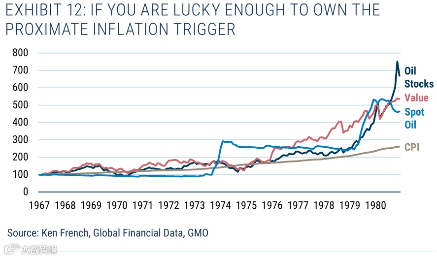 图12显示了石油现货、石油类股、价值型股和CPI的表现。石油公司在高通胀时期表现异常出色,考虑到油价的弹性及其在当时通胀创造中的作用,这并不令人意外。但请注意,价值型股票作为价值储存手段的表现也非常出色(优于现货石油)。