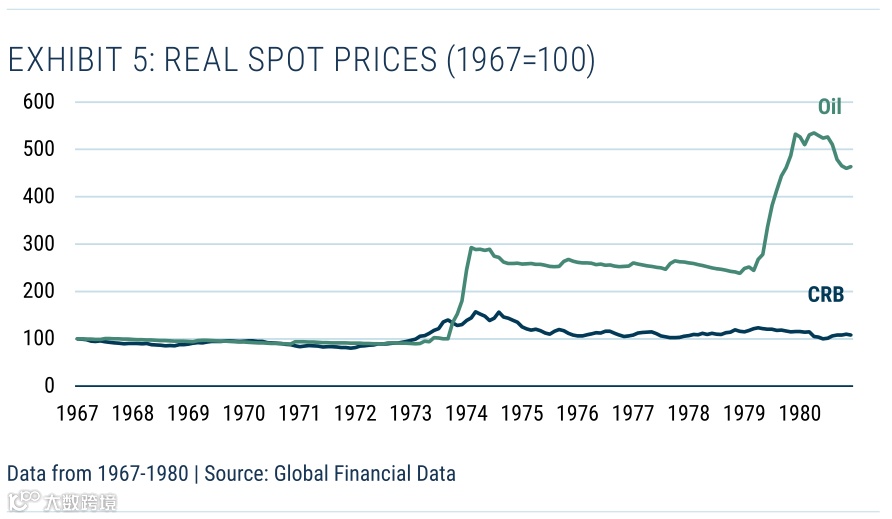 放大到1967年至1980年的高通胀时期,我们看到非石油大宗商品只是起到了保值的作用,而石油表现得非常好。我们之前多次提到的观点是,石油是人们认为大宗商品是良好的通胀保护“资产”背后的驱动原因,因为它是20世纪70年代工资价格螺旋的直接触发因素(见表5)。