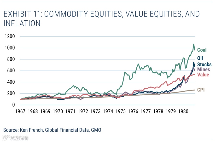 现在我们将转向大宗商品股权。我们怀疑,作为一种价值储存手段,它们的表现要比基础大宗商品好得多,因为它们很便宜——今天很可能再次如此。在高通胀时期,只有三种大宗商品股权——石油、矿山和煤炭。这些行业都表现不错,煤炭行业显然是赢家。我们也在附录11中包含了价值组以进行比较。