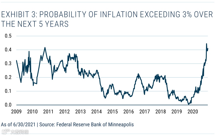长期读者会知道我们非常重视逆向工程方法,我们会问,为了使资产的定价有意义,我们需要相信什么。通货膨胀上限和下限,这转化为通货膨胀的概率超过一定的阈值水平上限。Minneapolis Fed映射这些上限价格为一个更容易理解的概率(见表3)。他们并没有深入到10年,但从5年的时间来看,目前的市场价格表明,通胀率超过3%的可能性为40%。为了对冲通胀上限,你需要相信未来5年通胀率达到3%的概率高于40%。