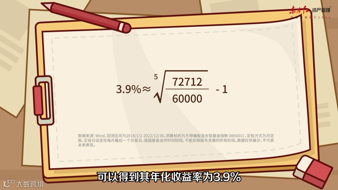 我们来看一个实际的例子。从2018年至2022年进行基金定投,每月定投1000元,坚持五年,那么最终投入总金额为60000元。假设以偏股混合型基金指数作为标的,五年后获得的资产价值为72712元。