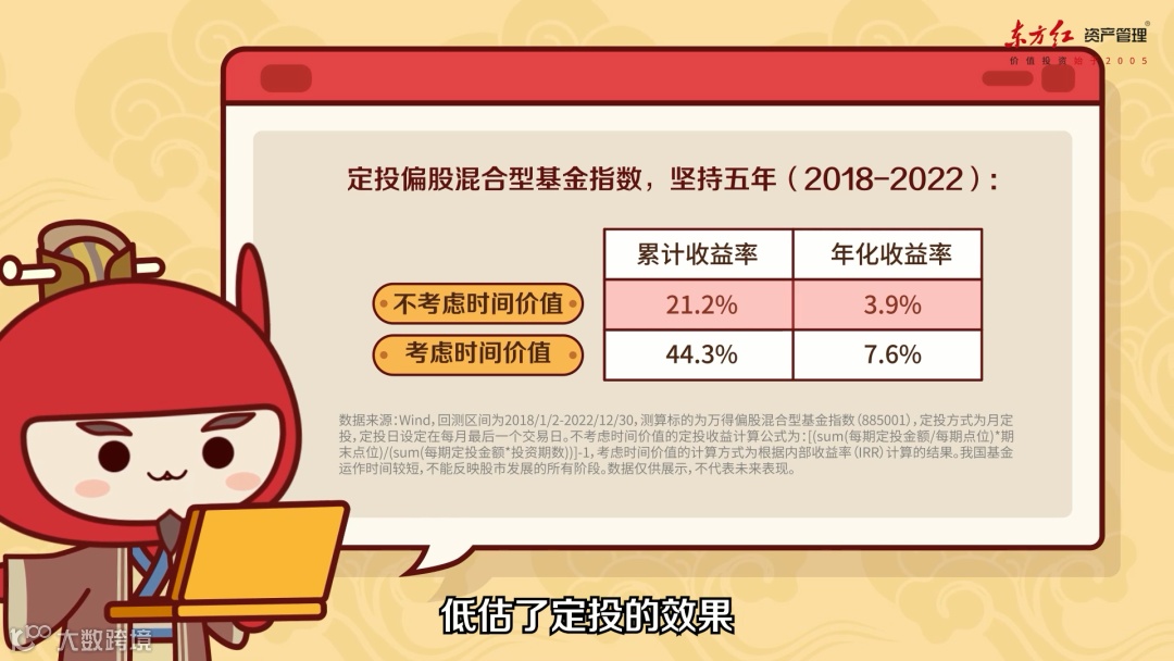 但是定投的资金均匀地分散在定投过程中,并不是简单的一次性投入。比如第一期投入的1000元钱已经过了五年的时间,而最后一期的1000元钱其实才投进去一个月,它们具有不同的价值。