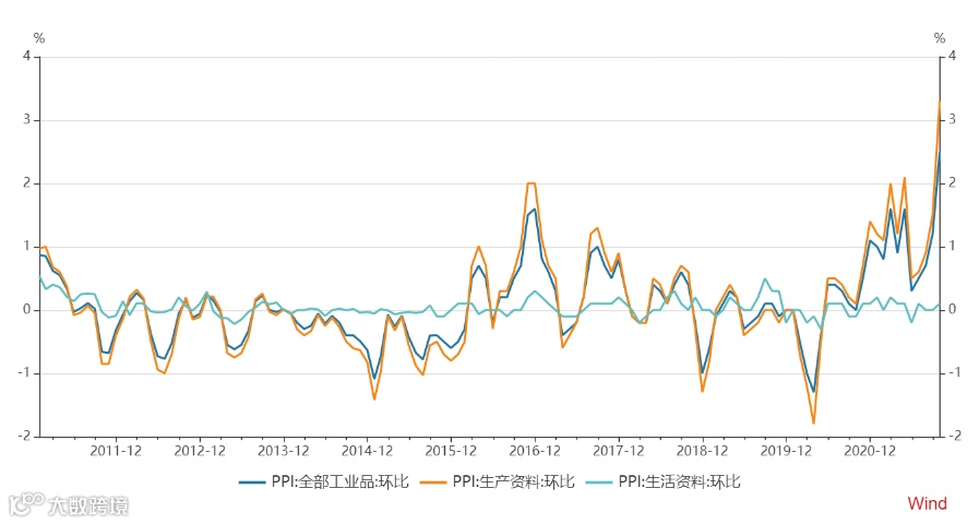 从历史数据上看,PPI的波动主要由生产资料贡献。