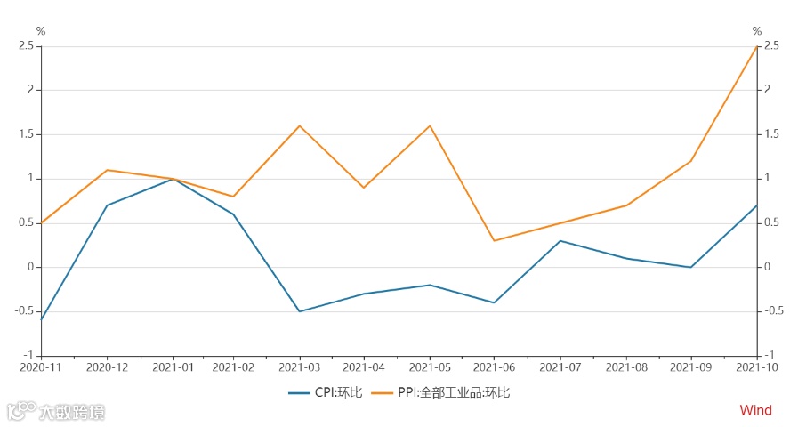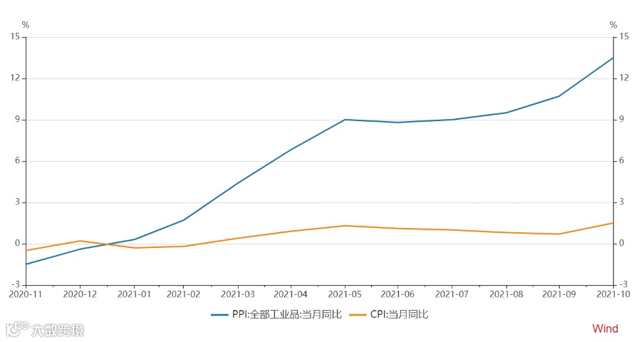 今年以来,CPI同比维持低位震荡,10月同比录得1.5%,预计年底上行至2-3%。PPI同比则陡峭上行,至10月已录得13.5%的历史高位,趋势外推来看,10-11月大概率确认顶部,随后开启震荡下行。从绝对水平来看,由于CPI与居民日常生活紧密相关,因此其波动幅度远小于PPI。