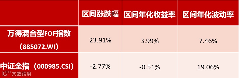 专业力量加持下,混合型FOF展现了远超全市场的表现。从下图数据看,在涨幅、年化收益、年化波动等指标下,万得混合型FOF指数表现都更为出色。