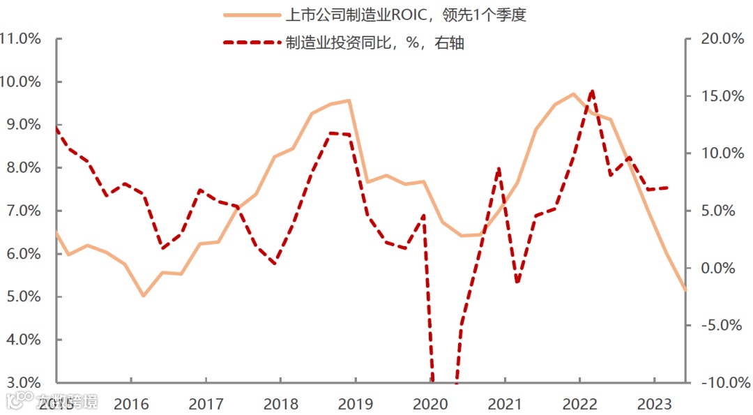需求不足的背后是居民收入预期放缓、地方政府“土地财政”模式遇阻、外需放缓。企业需求本质上来自于三个层面:居民消费支出、政府部门投资支出和海外需求。而当前居民收入预期放缓使得消费支出增速中枢下降,地方政府“土地财政”模式受阻使得投资增速放缓,全球经济大环境放缓叠加中美博弈使得外需放缓。需求不足将导致企业及全社会回报率下降,其中企业投资回报率下降体现为上市制造业企业ROIC放缓,这将显著影响企业(尤其是私营企业)的投资信心。