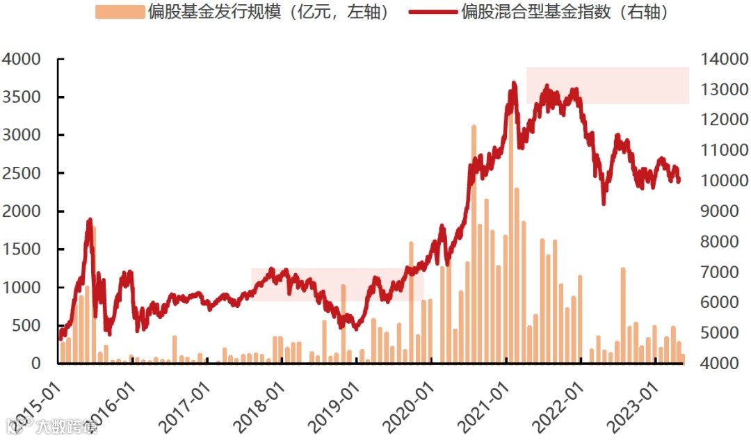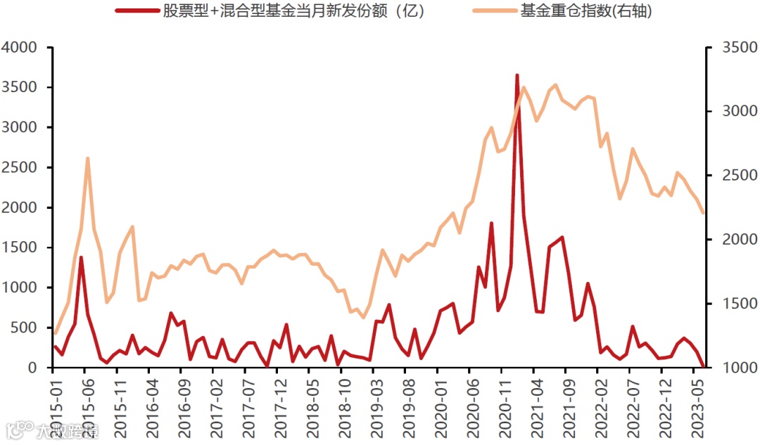 2023年年初至今公募新基金发行持续低迷,市场缺乏强有力的增量资金。截至6月初主动权益型基金累计发行份额仅不到800亿份,较去年同期下滑20%。可能原因一是2020-2021年主动权益型基金规模快速扩张,其增速明显高于可投资资产总规模增速,表明居民在一定程度上已透支了未来的风险预算;二是公募基金净值尚未修复形成拖累,负债端风险偏好改善或需等待市场确认反转。