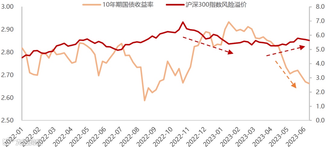 股市和国债收益率均接近去年10月低点,无风险利率的下行被高风险溢价对冲。当前资产价格已经隐含过度悲观的经济预期,当前十年期国债利率已下行至2.7%下方,接近去年低点;但二季度以来沪深300的风险溢价再度抬升,抵消了无风险利率下行的效果。