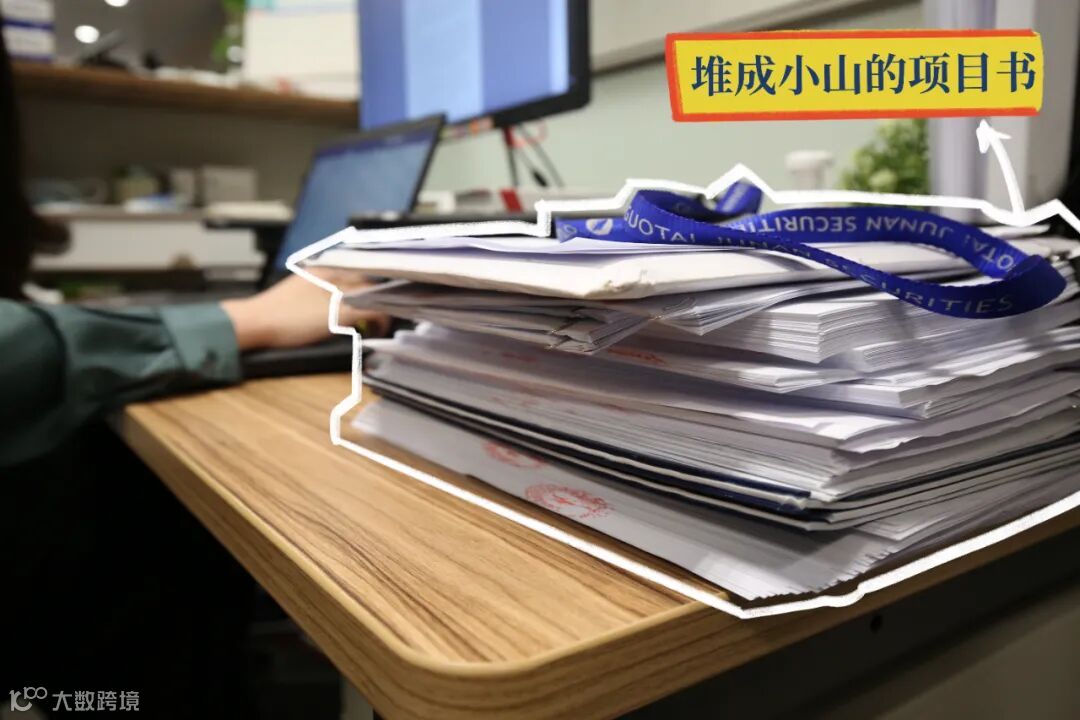 堆成小山一样的项目书背后,是团队一起实地走访、细致尽调后的成果。
