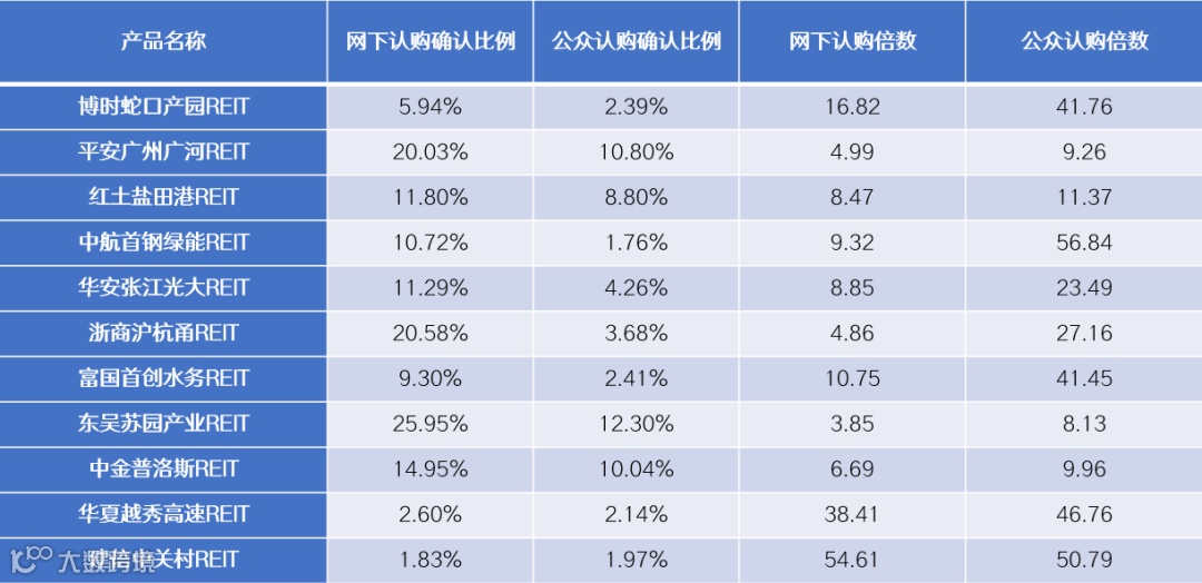 这一批项目相较于首批上市的九只产品而言,一方面,项目整体发行周期较长,投资人前期了解沟通地更为充分,有更多的投资人参与其中;另一方面, 11月银保监会发布《关于保险资金投资公开募集基础设施证券投资基金有关事项的通知》(下称《通知》),从保险机构资质、投资标的条件、风险管理流程等都方面明确保险资金投资公募REITs的相关监管要求,为保险资金参与公募REITs提供了监管支持,保险机构参与公募REITs投资的热情进一步激发,最终使得参与机构显著增加,这也进一步促进了REITs市场的火热。如下表所示,本次无论是网下投资人还是公众投资人部分的认购比例明显低于首批项目,投资人的热情可见一斑。