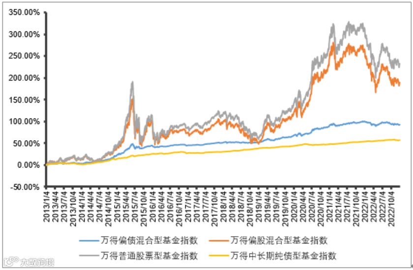 Wind统计显示,近十年间(2013.1.1-2022.12.31),万得偏债混合型基金指数走势较为稳健,收益及波动幅度均低于万得普通股票型基金指数和万得偏股混合型基金指数,而高于万得中长期纯债基金指数,在收益与波动之间实现了一定的平衡与兼顾。