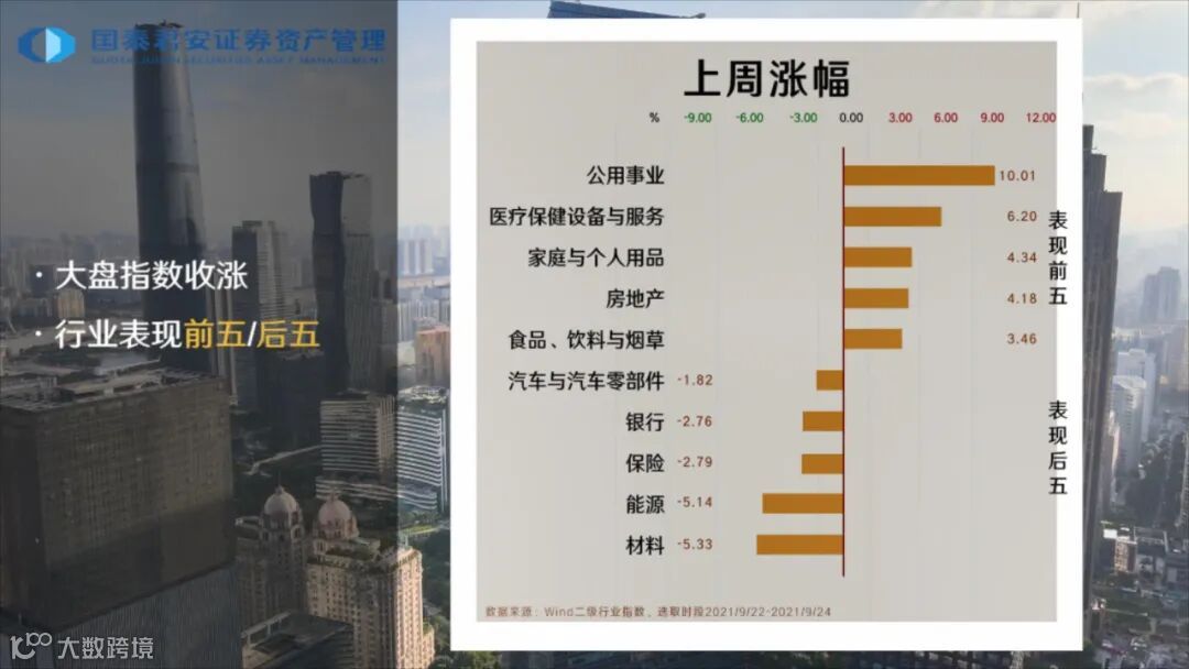 行业变动来看,上周各行业涨跌互现。公用事业领涨,涨幅达到10.01%,医疗保健设备与服务、家庭与个人用品、房地产、食品、饮料与烟草等行业紧随其后;材料行业跌幅最大,为-5.33%。