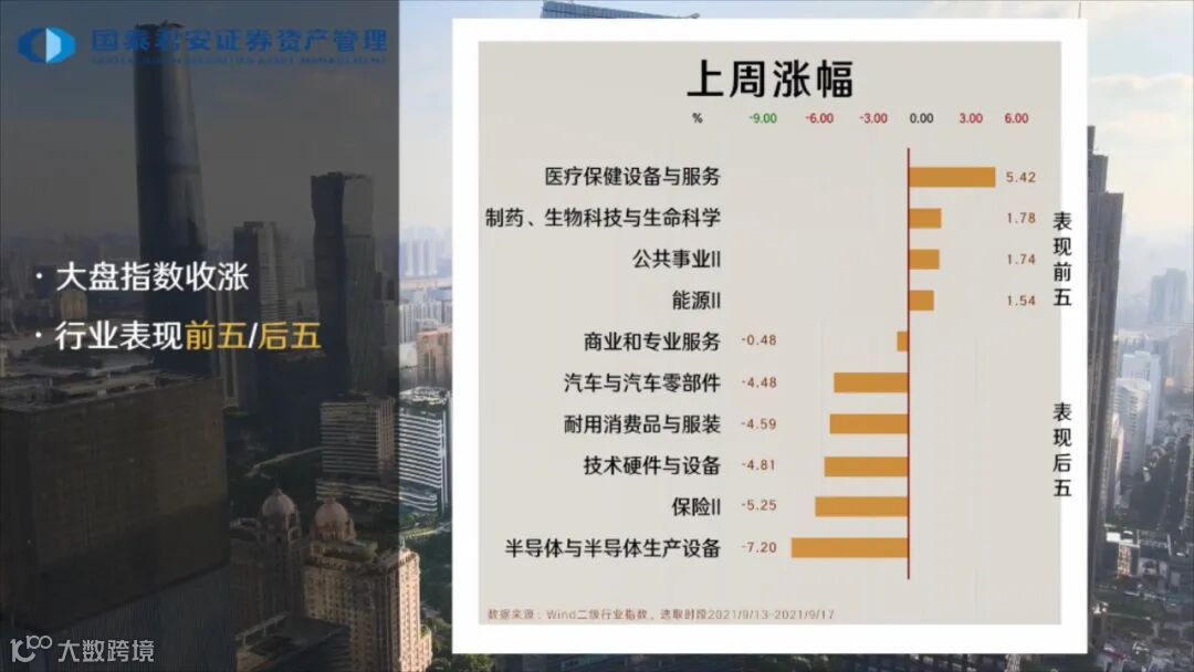行业变动来看,上周仅有四个行业上涨,其余均呈现不同程度的下跌,医疗保健设备与服务行业领涨,涨幅为5.42%,制药、生物科技与生命科学、公共事业、能源、商业和专业服务等行业紧随其后;半导体与半导体生产设备行业跌幅最大,为7.20%。