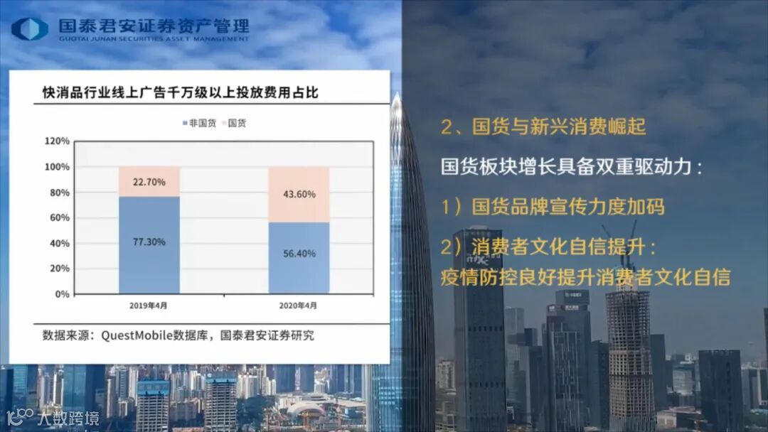 据统计,在2020年4月快消品行业线上广告千万级以上投放费用中,国货的占比较前一年提高了20.9%,体现了加大的宣传力度。此外,国内疫情防控良好也提升了消费者的文化自信。这两个因素是国货品牌崛起的主要驱动力。