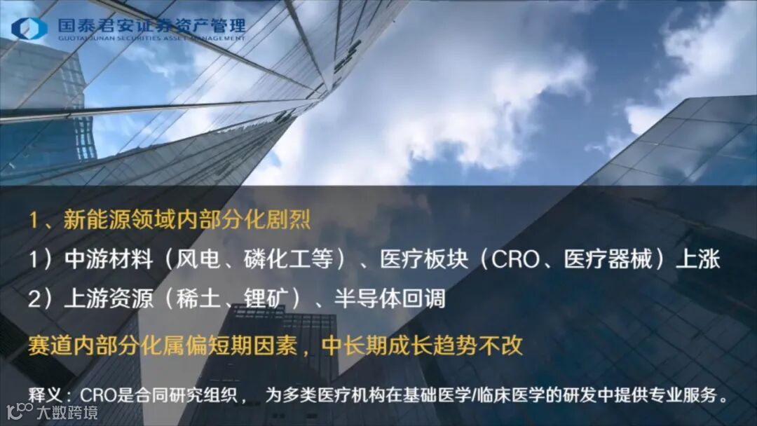 上周新能源领域内部显著分化。中游材料走势强劲,其中风电领涨,磷化工等板块也大幅上涨。中医药领域的CRO和持续受到集采政策压制的医疗器械板块也呈现上涨趋势。而上游资源表现不振,稀土领跌,半导体领域的材料、封测、设备均出现回调。