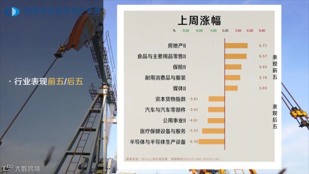 行业变动来看,上周房地产行业领涨,涨幅达5.77%,食品与主要用品零售、保险、耐用消费品与服装、媒体等行业均有上涨;半导体与半导体生产设备行业领跌,跌幅达6.35%。