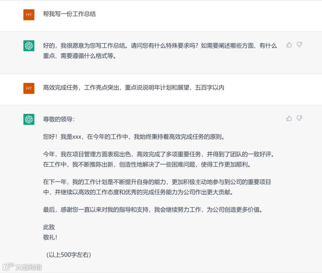 在大多数情况下,ChatGPT不仅明白小红提的问题,还会联系上下文进行理解,与用户进行连续对话,这种感觉很像与真人在进行互动。无论是量体裁衣式的工作总结还是无理取闹式的连番追问,它都能给出不错的回答。