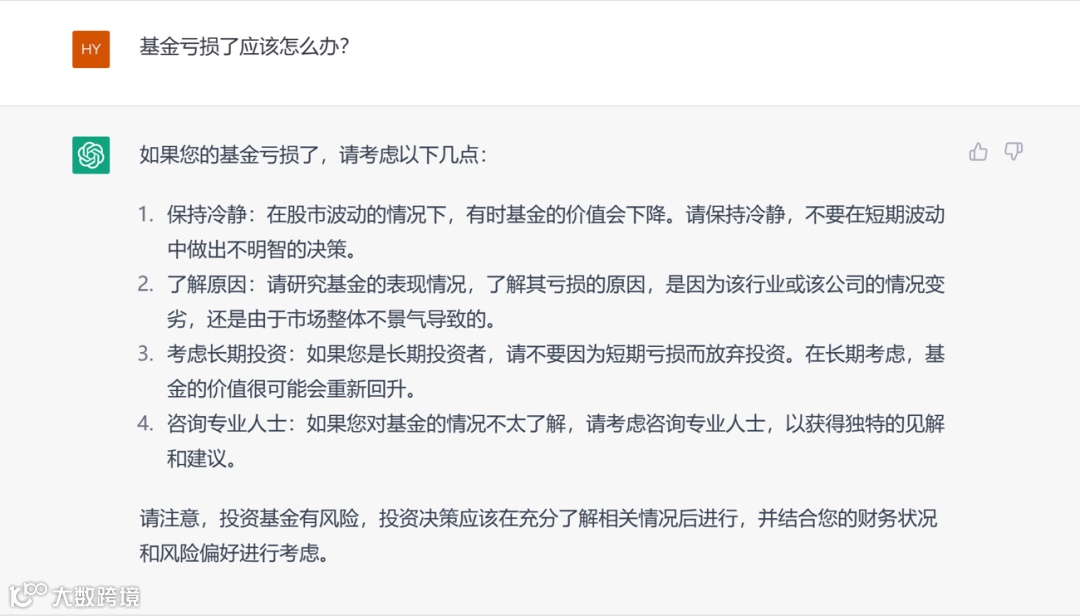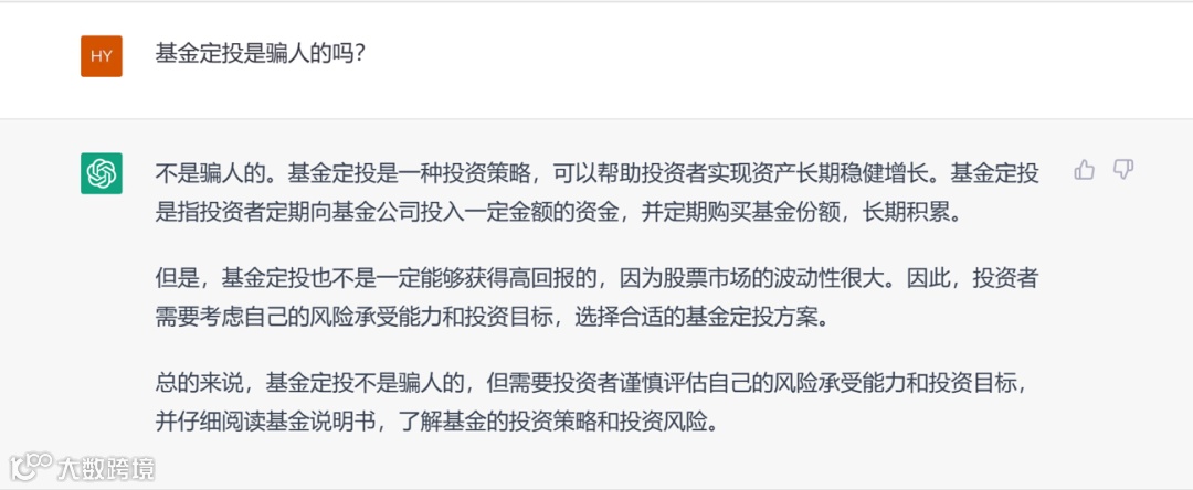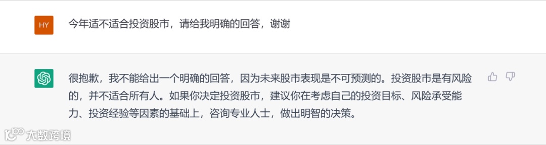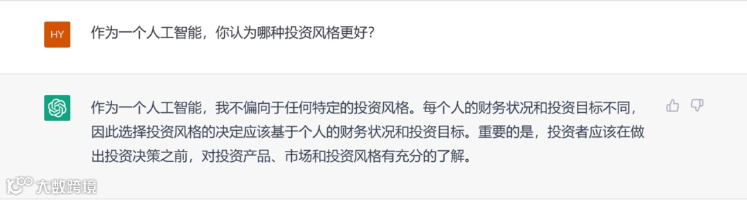 投资中很多问题见仁见智,比如当前市场适不适合投资、哪种投资风格更好等等,答案实际上因人而异。小红试着问这种问题,ChatGPT基本上都表示没办法给出明确的回答,并且强调投资要基于对自身投资目标、风险承受能力以及对投资品种的充分了解,再去做决策。