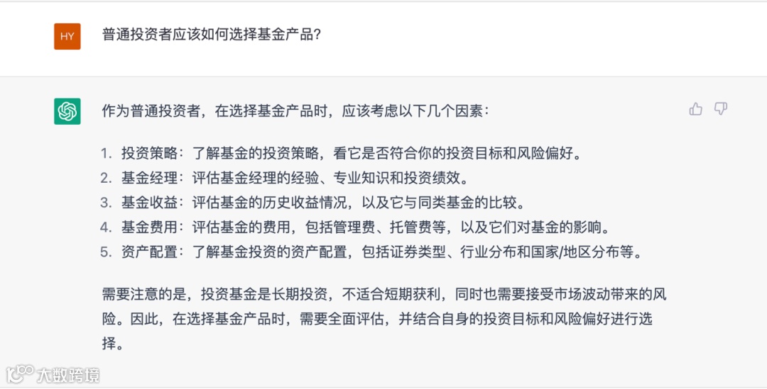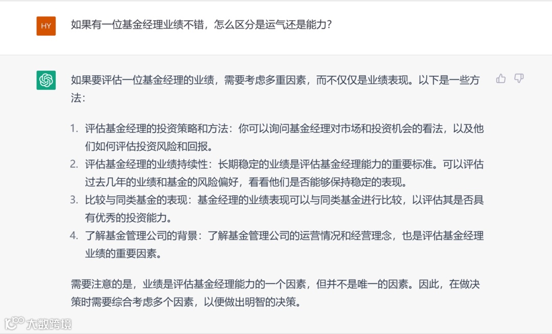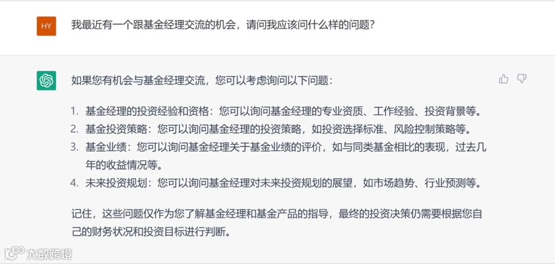 投资基金之前,了解基金经理是非常有必要的,ChatGPT会关注基金经理的哪些方面?从回答来看,虽然比较笼统,但确实涵盖了若干重点问题,比如管理人背景、基金经理经验和资质、过往业绩情况、未来的投资规划等。如果小红下回需要访问基金经理,大家还有其他要补充的吗?