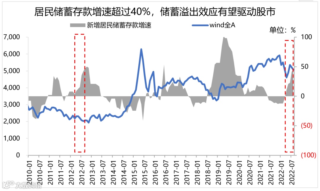 居民储蓄存款是投资理财的蓄水池。在经济低迷时居民趋于保守,随着居民投资房地产意愿明显回落,2022年上半年住户新增存款已经超过去年全年,居民新增储蓄存款增速超过40%,2012年也是类似情况。储蓄存款是风险低收益率低的投资手段,一旦宏观经济情况好转,风险偏好提升,居民往往会将储蓄存款进行投资。历史上,当居民过去一年储蓄存款增速超过40%,就会触发“储蓄溢出效应”,通常会酝酿一波指数级别的上涨。在房住不炒的大基调下,房价仍保持弱势,居民储蓄更可能溢出到股票和基金市场。