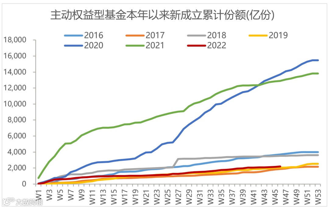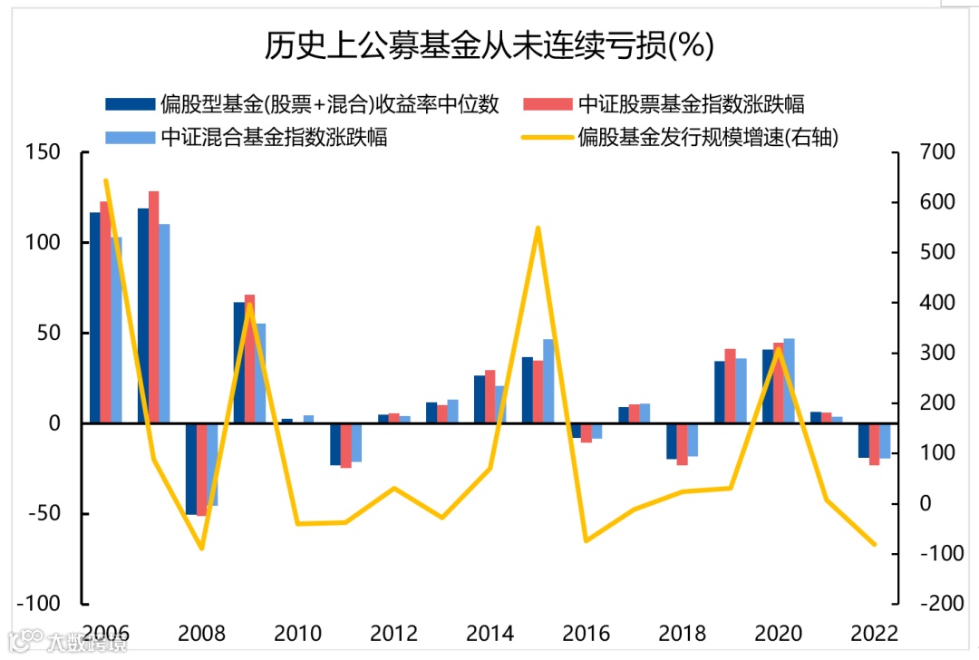 2022年公募基金发行明显放缓,截至11月,主动权益型基金仅新发2200亿份左右,远少于2020年同期的1.4万亿和2021年同期的1.3万亿。而产品赚钱效应也有待修复,从历史来看,公募基金从未连续亏损。若明年基金收益率好转,基金发行也有望回暖。