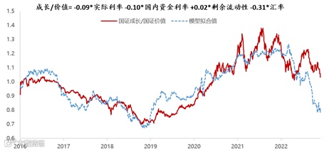 展望2023年,在弱复苏的背景下大部分板块基本面可能依然一般,仍缺乏清晰的主线,更多仍是政策驱动下的板块轮动。根据宏观四因子(美国实际利率、中国资金利率、剩余流动性、人民币汇率)拟合的市场风格模型,对于2016年以来的成长/价值风格的相对表现有较强的解释力度(R2=78%)。美国加息政策转向将使得美国实际利率下降,美元/人民币汇率下降,进而利好成长风格;国内稳增长政策加码将引导国内资金利率上升,剩余流动性下降,进而利好价值风格,因此价值和成长都有望获得阶段性机会。