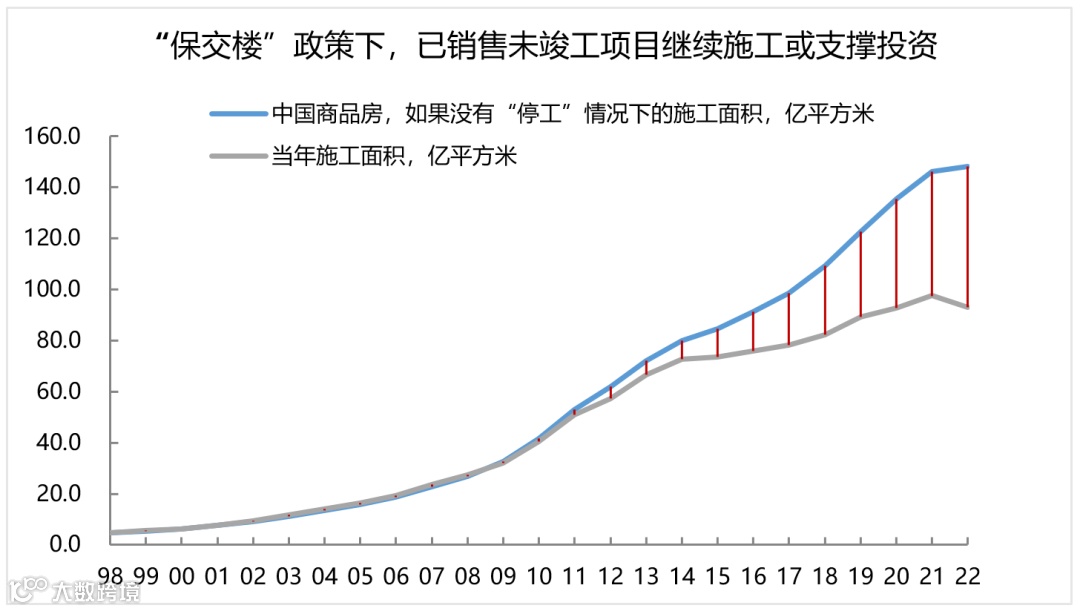 内需扩大的方向之二为地产。经济承压背景下,政策对于防范和化解地产部门系统性风险的诉求进一步上升。供给端政策从“保项目”逐步向“保主体”过渡,对开发商融资端的约束进一步下降;明年对于需求端的刺激政策有望进一步升级。而“保交楼”同时符合稳增长、保民生两大政策方向。在“保交楼”的政策下,尽管地产销售短期难有明显起色,但“已销售未竣工”项目继续在建或支撑地产投资。假设在“保交房”政策下,已销售但未竣工的项目全部处于施工状态,其余施工面积延续以往历史趋势,那么即使销售面积继续放缓拖累新开工面积,地产投资增速可能也会收窄至-3.4% ~ -1.9%。