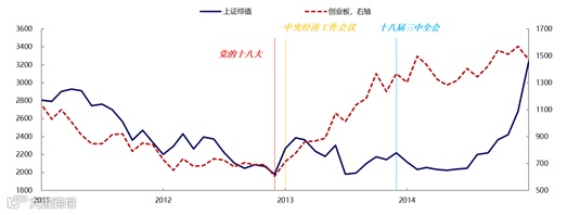 与2012-2013年有一定相似之处,在市场对于经济降速体感边际改善之后,相信市场信心会逐步恢复,进而开始展望长期结构性机会。2012年底重要会议先后召开,市场信心逐渐恢复;2013年整体经济依然偏弱,抑制了市场投资者对于整体市场的热情,上证综指底部震荡,但并没有限制资金展望长期经济增长动力,创业板自2012年底开始持续上涨。