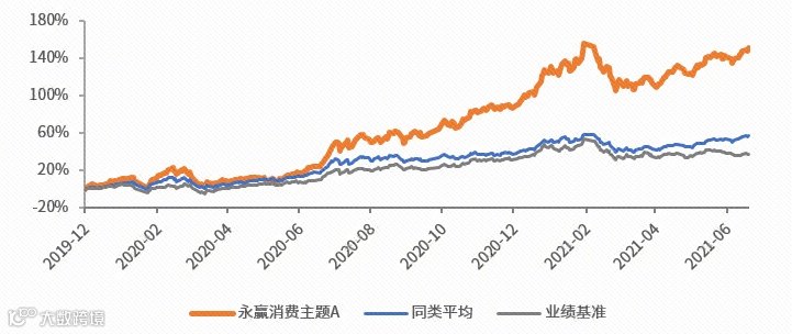 注:基金的过往业绩及其净值高低并不预示其未来业绩表现。业绩数据经托管人复核,2019/12/12-2021/6/30。同类平均表现以灵活配置型基金指数作为参考,数据来源于wind。永赢消费主题基金业绩比较基准为中证内地消费主题指数收益率*60%+中国债券总指数收益率*40%。永赢消费主题A:李永兴自2018/11/6-2020/2/7任基金经理,常远自2019/12/12起任基金经理。