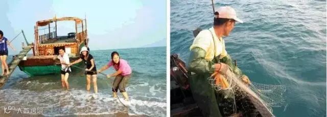 乘坐渔船出海,置身碧海蓝天,坐在船上聊天畅谈,众人一块撒网、收网,享受捕鱼乐趣、体验团队协作中的收获。