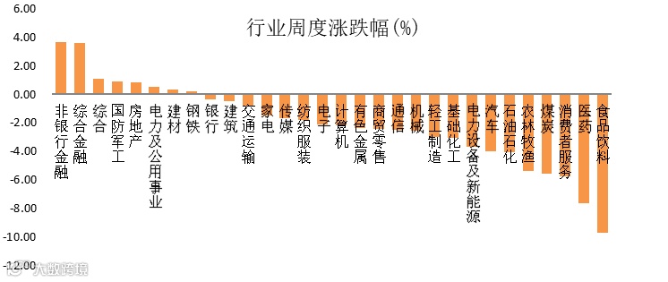 结构方面,上周30个行业板块有8个上涨,有22个下跌;其中表现相对较好的是非银金融(+3.6%)、综合金融(+3.6%)、综合(+1.1%),而表现居后的则是食品饮料(-9.7%)、医药(-7.7%)和消费者服务(-5.7%)。