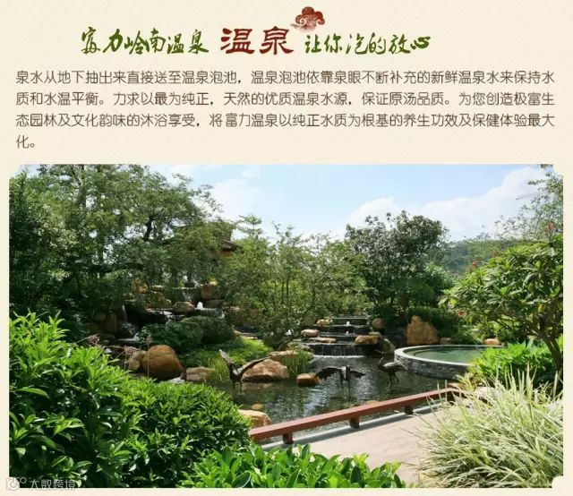 富力岭南花园温泉分为汉方养生、香薰、动感娱乐、日式风情、浪漫等五大区。温泉水资源丰富,水质晶莹剔透,富含锰、钼、硒、锌、锂、氟、碘、镍、钴、铜等48种微量元素,俗称小苏打泉,并常年以60℃-80℃的亘古之温似天赐琼浆般涌出。