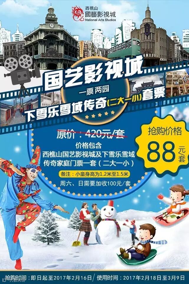国艺影视城+下雪乐雪域传奇家庭套票1张(2成人+1.2-1.5米小童)
